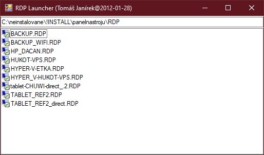 Načte *.rdp soubory ze vstupního adresáře. Po dvojkliku na konfiguraci daného RPD spojení, se otevře vycentrované okno na aktuální obrazovce (kde byl RDP_launcher puštěn). Je možné rovněž otevřít v celoobrazovkovém režimu a to buď z kontextové nabídky nebo při stisknuté klávese SHIFT.