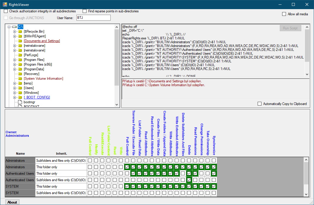 Program umožňuje graficky zobrazit práva k jednotlivým adresářům v systému. Analyzovat podadresáře pro konflikty v dědění práv atd. Rovněž generuje automaticky skript pro nastavení daných práv z příkazové řádky.